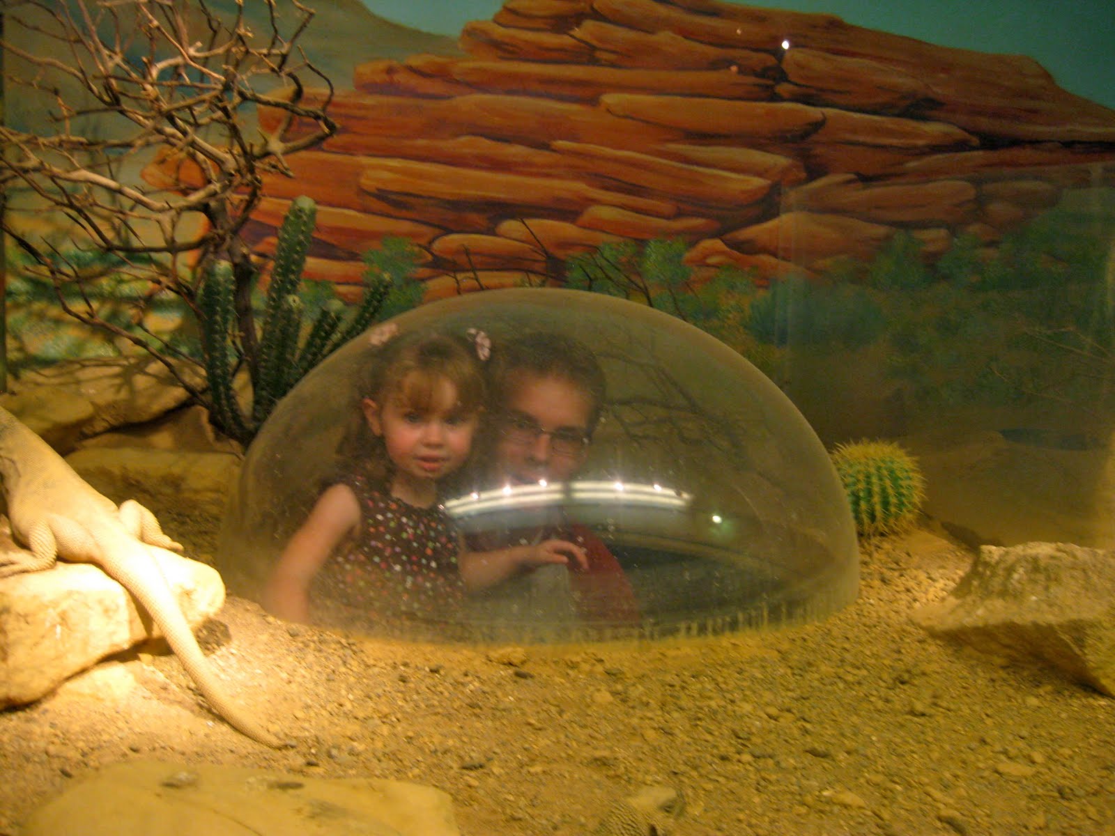 In the lizard room Maddy saw a Gila Monster and loved it. She'd gasp and say, "Look at the big lizard." When Eth took her in a observation dome to see other lizards she freaked. Maddy's not a fan of small spaces. But the highlight of the lizard room was the lizard cut outs. We all took turns taking pictures and Maddy would just laugh and run sticking her face in and out of the hole.
